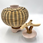 Basket made of hand woven reed, along with wheel thrown /hand formed ceramic.
