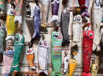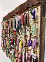 Almost 100 individually hand carved and painted fish adorn this fanciful handmade/carved wood & metal board.