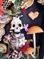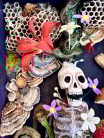 Cigar Box, handmade skeleton sculpture , egg shell mushrooms, felted bumble bee, sculpted fiddle head ferns, crystal, handmade flowers, morel mushroom, turkey tail mushrooms