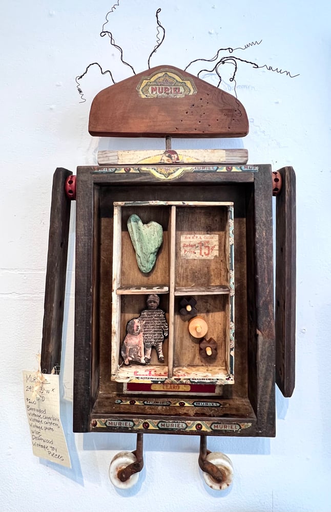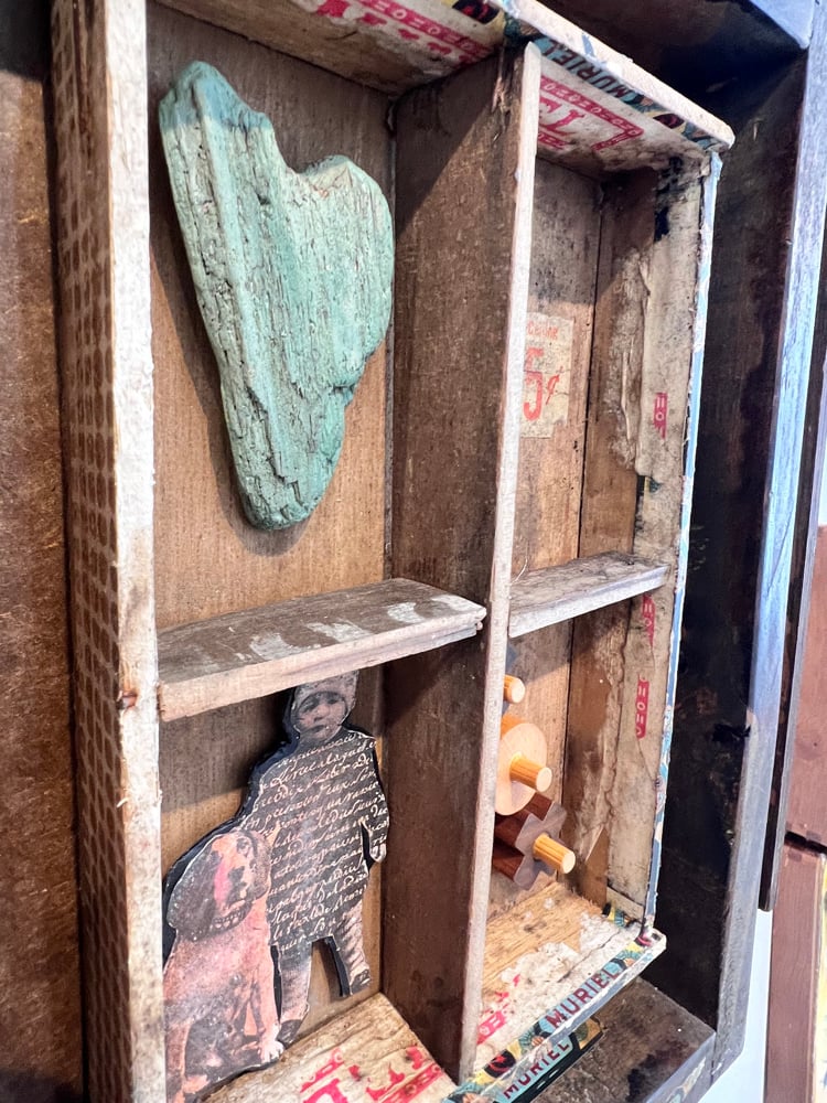 Vintage cigar box, photos, vintage toy pieces , barn wood, vintage casters