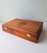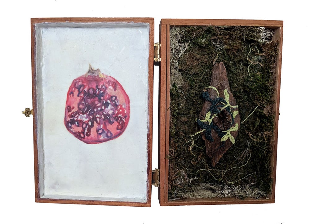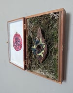 Encaustic painting on one side, 3 dimensional sculpture wih found moss, embroidery and wood inside cigar box
