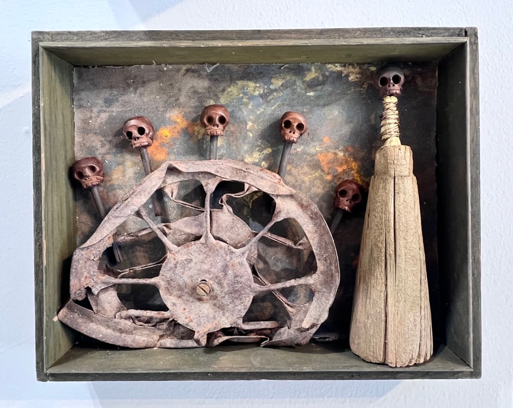 Vintage cigar box, found metal, carved wood skelly heads